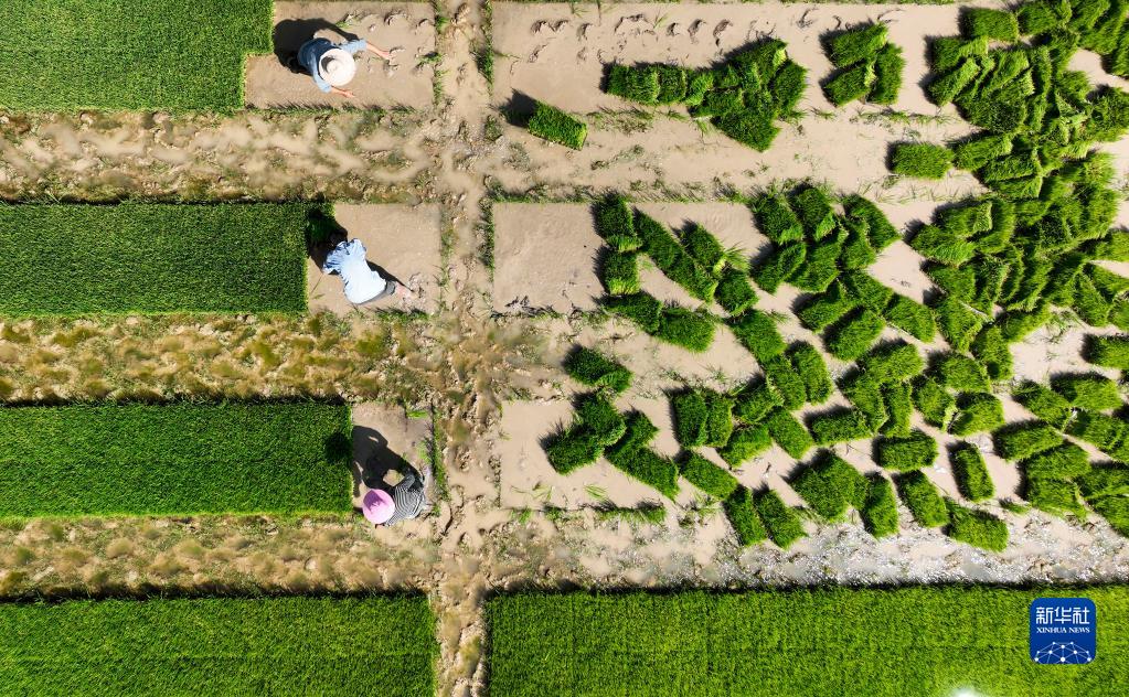 5月5日,農民在四川省南充市蓬安縣睦壩鎮虹管村稻田里起秧(無(wú)人機照片)。