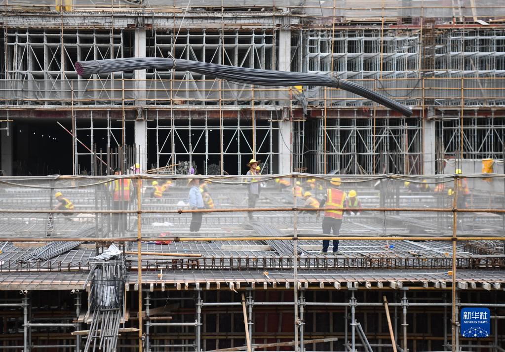 5月5日,在廣州黃埔區的中山大學(xué)附屬第三醫院嶺南醫院二期項目,工人在指揮吊運鋼筋。