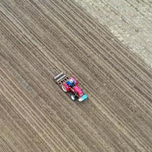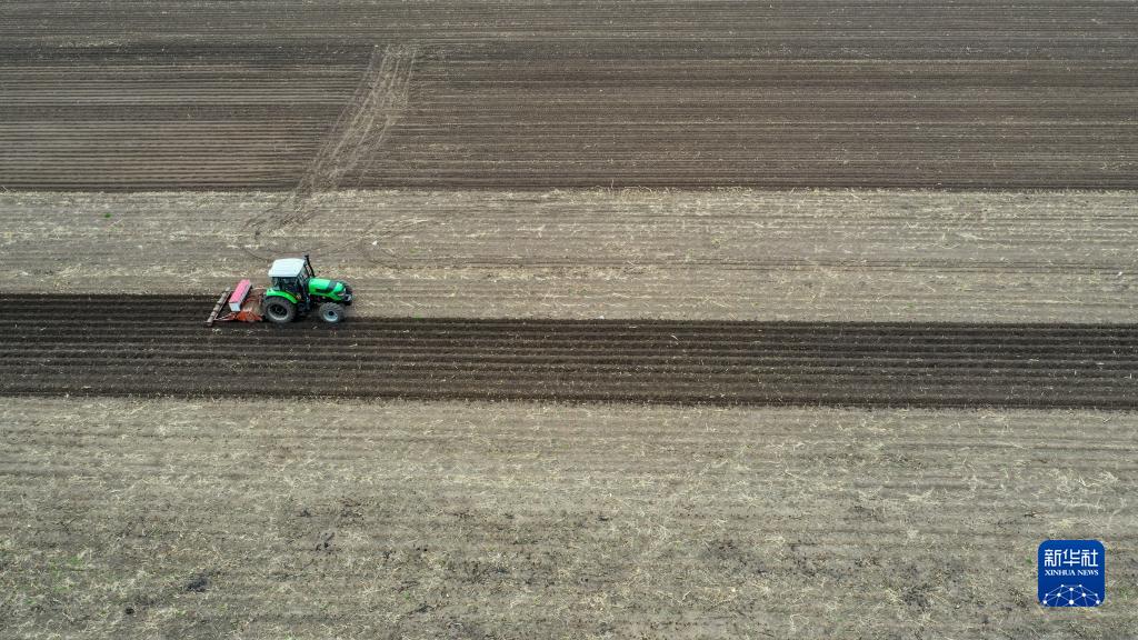 5月5日,在吉林省長(cháng)春市九臺區龍嘉街道水鄉村,農民駕駛農機進(jìn)行春耕作業(yè)(無(wú)人機照片)。