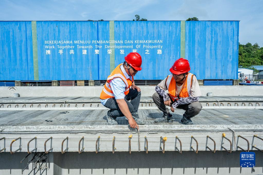 4月26日,在馬來(lái)西亞吉蘭丹州的馬東鐵項目一分部制梁場(chǎng),技術(shù)主管鄧友志(右)和馬來(lái)西亞本地青年員工鄧德緯討論生產(chǎn)情況。