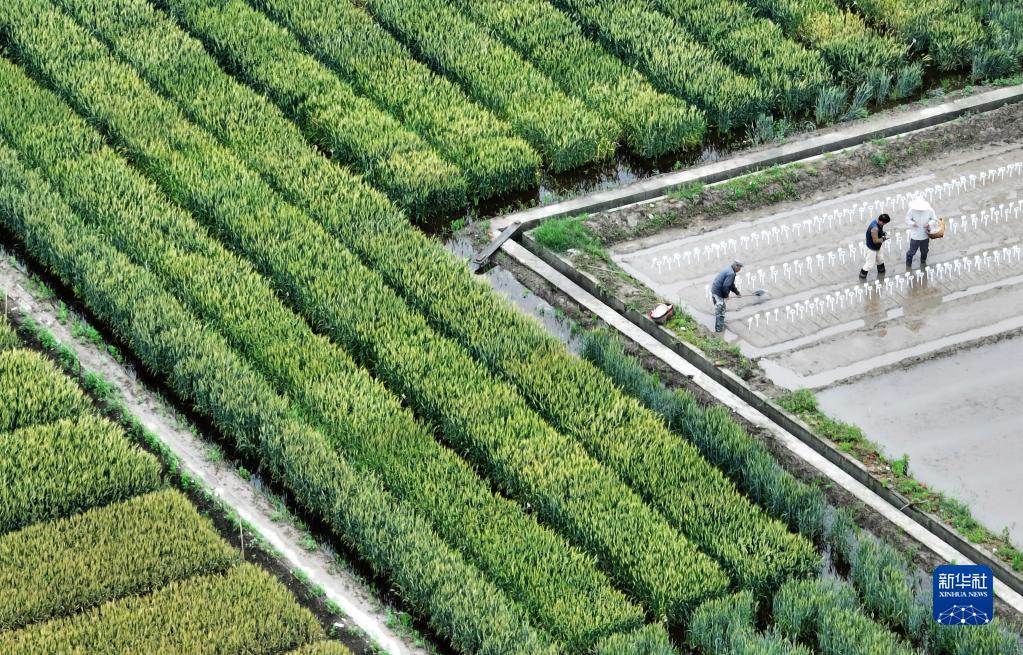 5月6日,在江蘇里下河地區農科所(揚州市農科院),農民在試驗田勞作(無(wú)人機照片)。
