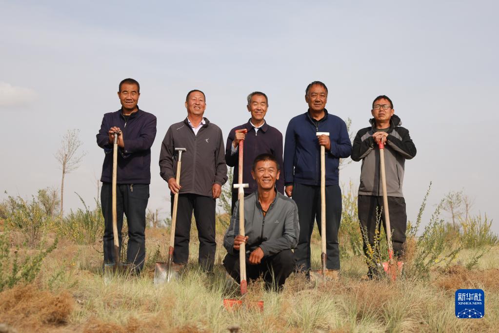 5月6日,八步沙兩代治沙人在古浪縣的一片治沙區勞作后合影留念。他們從左至右分別為:羅興全(后左一)、石銀山(后左二)、郭萬(wàn)剛(后中)、賀中強(后右二)、程生學(xué)(后右一)、郭璽(前)。新華社記者 馬希平 攝