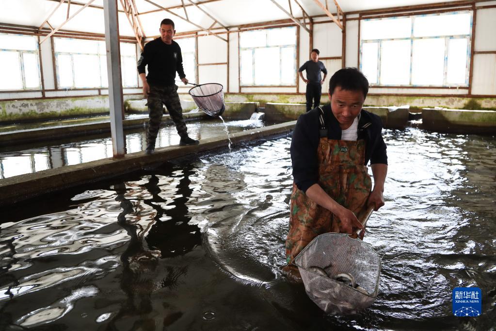 5月7日,養殖基地負責人耿海濤(前)在育苗區打撈細鱗鮭魚(yú)苗。