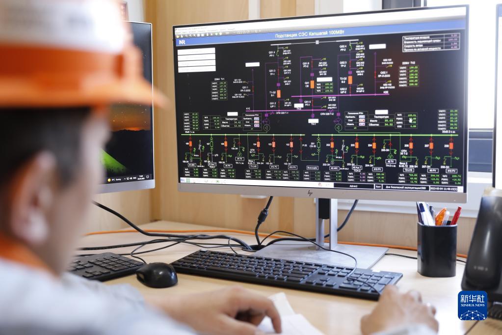 5月4日,在哈薩克斯坦阿拉木圖州,工作人員監控卡普恰蓋100兆瓦光伏電站運行情況。