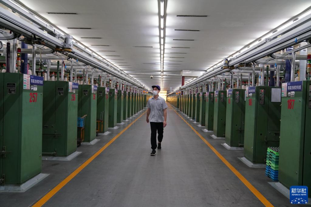 5月8日,工人在無(wú)錫一棉紡織集團長(cháng)江車(chē)間內巡視,該車(chē)間使用大量自動(dòng)化設備。