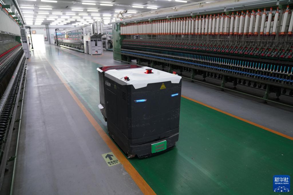 5月8日,在無(wú)錫一棉紡織集團長(cháng)江車(chē)間,自動(dòng)運輸設備在工作。