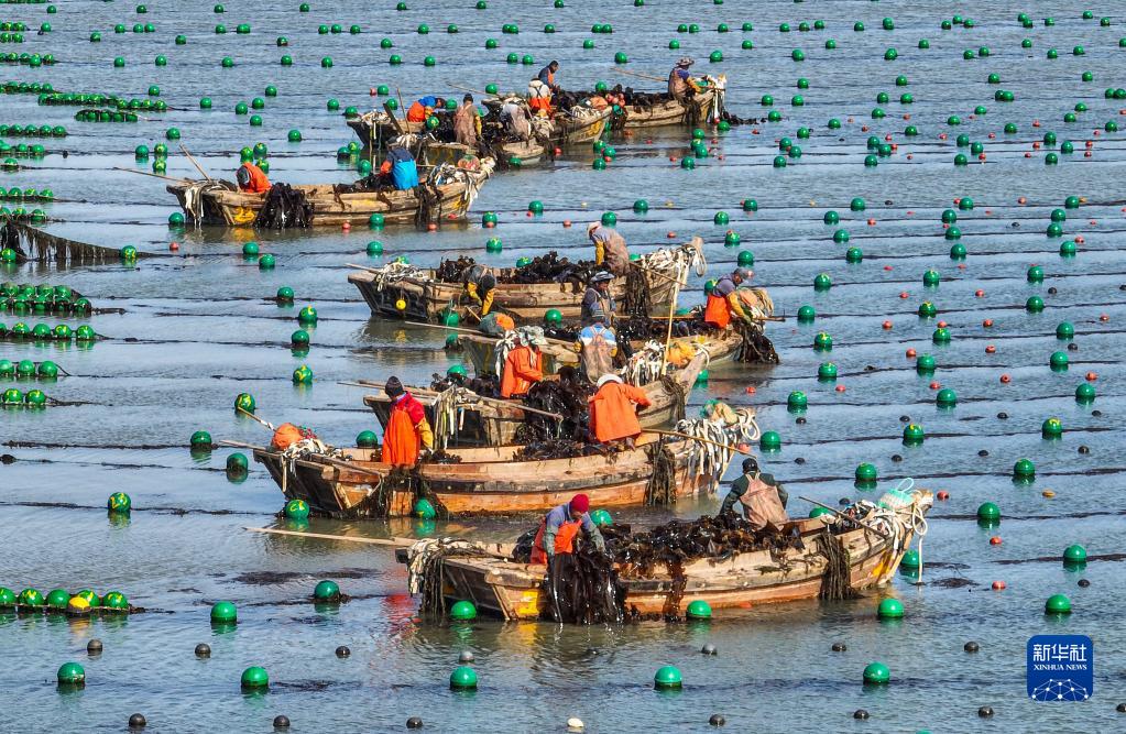 5月8日,在山東省榮成市愛(ài)倫灣海域海帶養殖區,漁民采收海帶(無(wú)人機照片)。