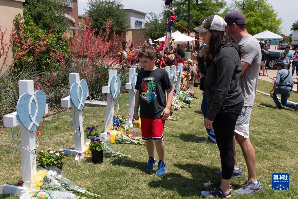 5月8日,在美國得克薩斯州達拉斯以北城鎮艾倫,人們在購物中心槍擊事件現場(chǎng)附近悼念受害者。