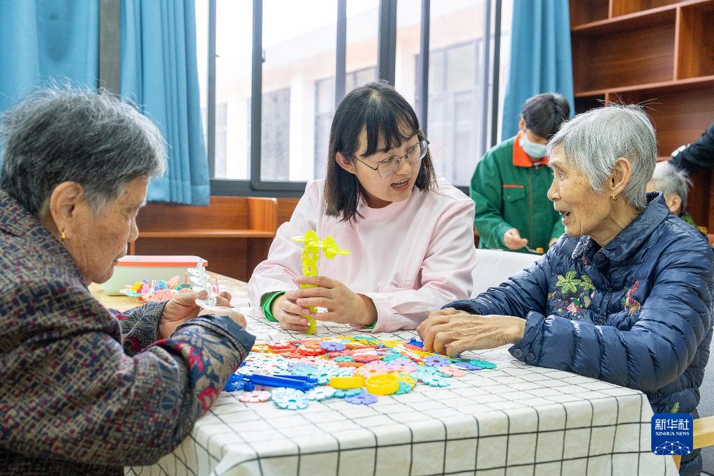 5月9日,在江西省南昌市青云譜區三家店街道南蓮社區嵌入式養老院,護士在與老人一起玩拼雪花片游戲。