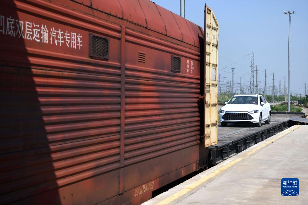 5月9日,在鐵路水家湖貨運站,工作人員裝運新能源汽車(chē)。