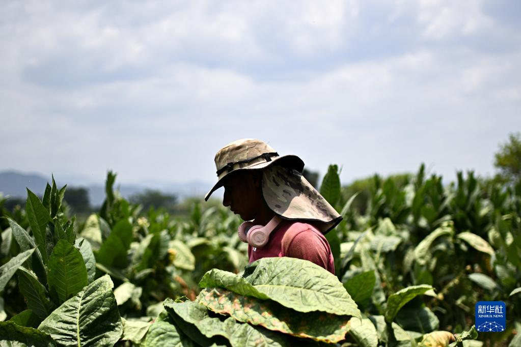 5月8日,在洪都拉斯南部城市丹利的一家雪茄煙葉種植園,工人采摘煙葉。