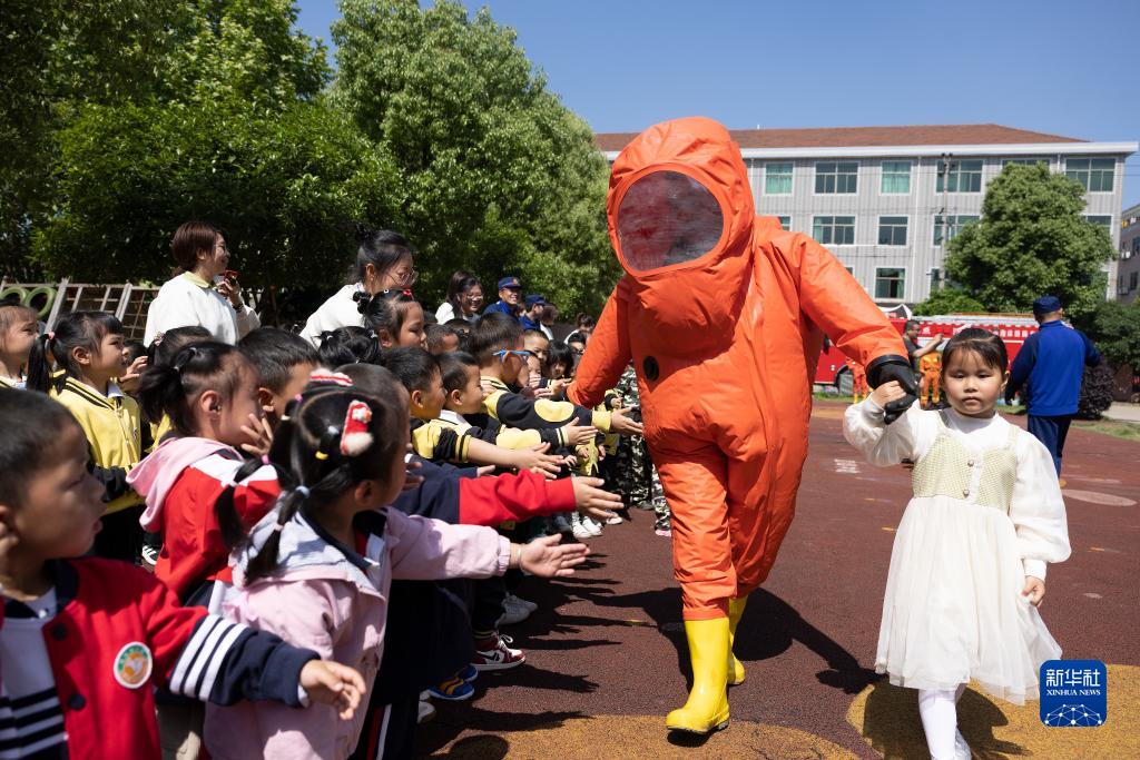 5月9日,浙江省諸暨市姚江鎮應急消防救援站的消防員(右二)與該鎮直埠幼兒園的孩子們互動(dòng)。