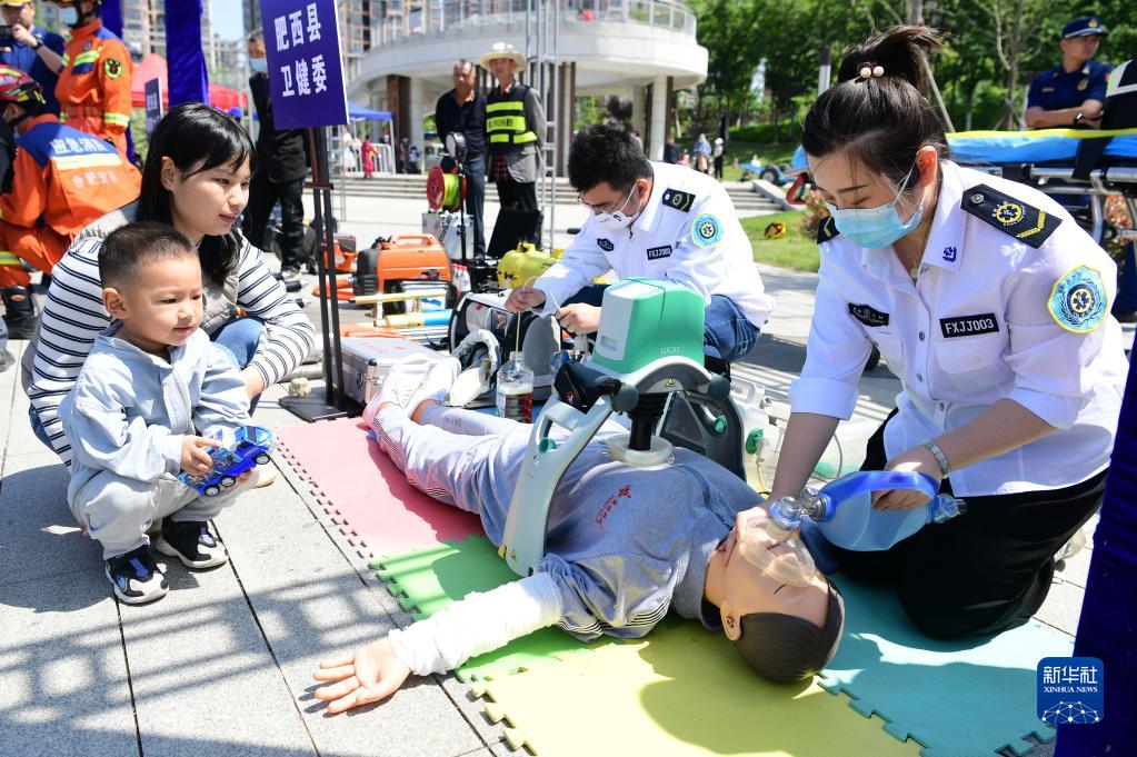 5月9日,2023年安徽省防震減災科普宣傳周暨合肥市第八個(gè)防震減災宣傳演練月主場(chǎng)活動(dòng)在肥西縣上派鎮舉行。這是市民在應急救援裝備展示區觀(guān)摩全自動(dòng)心肺復蘇儀演示。