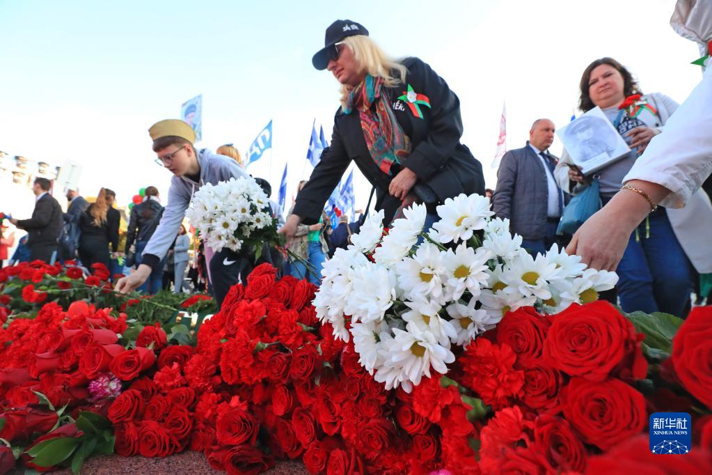 5月9日,白俄羅斯民眾在明斯克的勝利廣場(chǎng)向勝利紀念碑獻花。