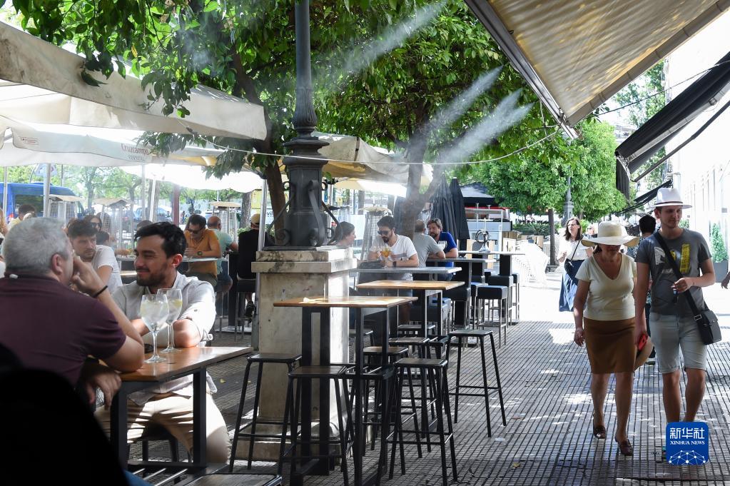 5月7日,西班牙塞維利亞街頭的酒吧開(kāi)啟噴霧降溫。