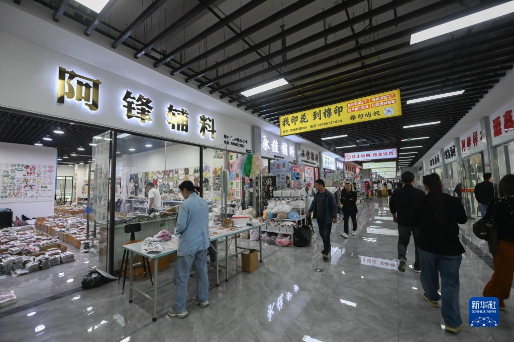 5月10日,在位于湖州吳興區織里鎮的織里國際輕紡城內,客商在挑選樣衣、輔料、配飾等。