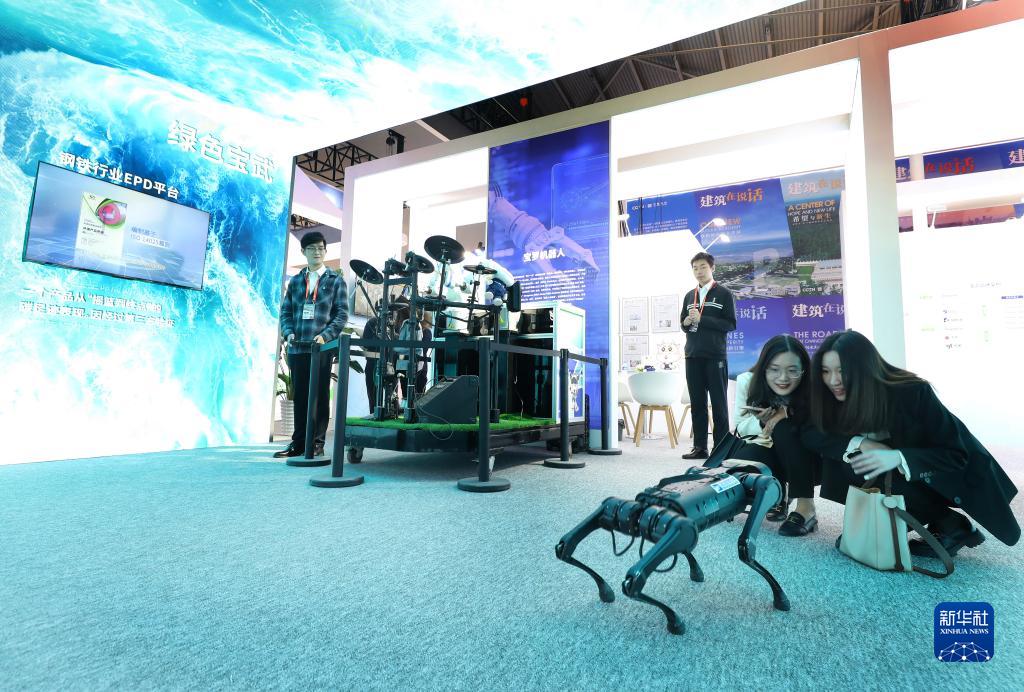 5月10日,參觀(guān)者在中國寶武展臺上與一個(gè)四足機器人互動(dòng)。
