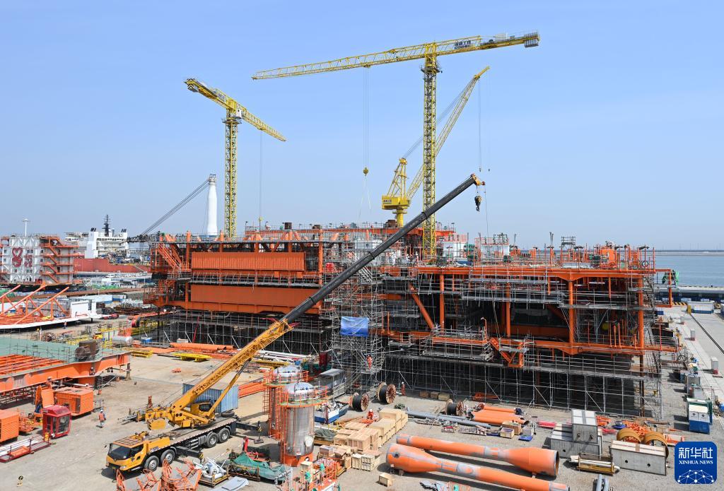 5月10日拍攝的渤中19-6凝析氣田一期開(kāi)發(fā)項目平臺建造現場(chǎng)。