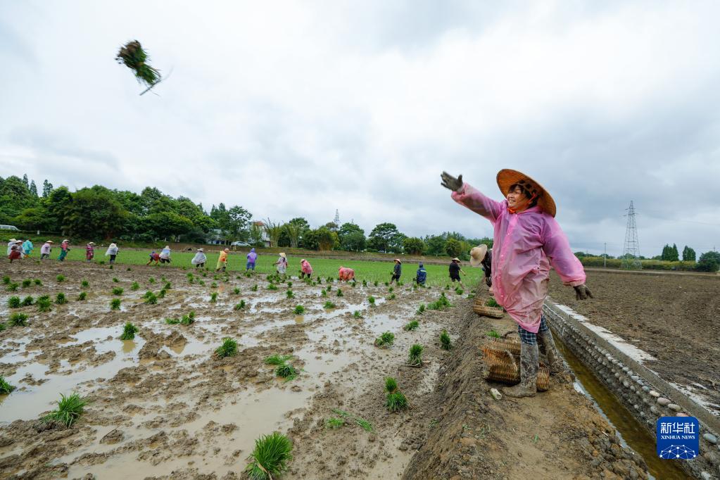 5月9日,在四川省崇州市道明鎮協(xié)和社區,農民向一片高標準農田里拋水稻秧苗,以方便其他農民插秧。