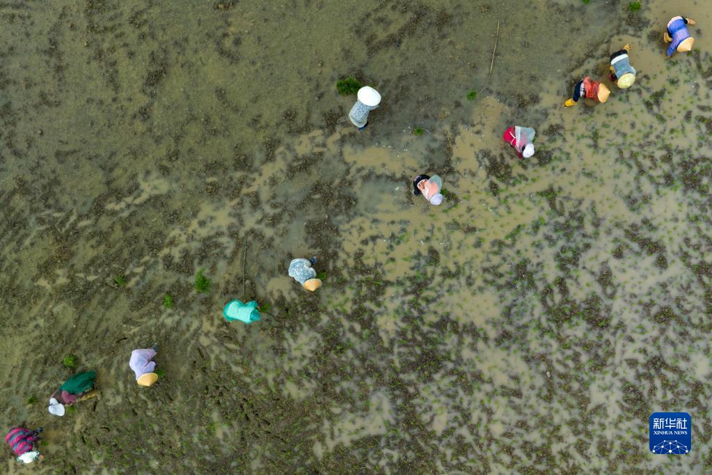 5月9日,在四川省崇州市道明鎮協(xié)和社區,農民在一片高標準農田里種植水稻(無(wú)人機照片)。