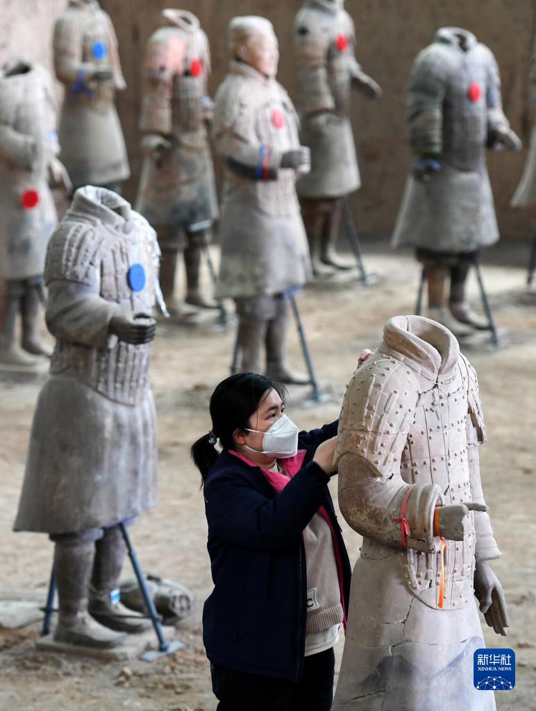工作人員在秦兵馬俑一號坑遺址進(jìn)行秦俑修復(4月26日攝)。