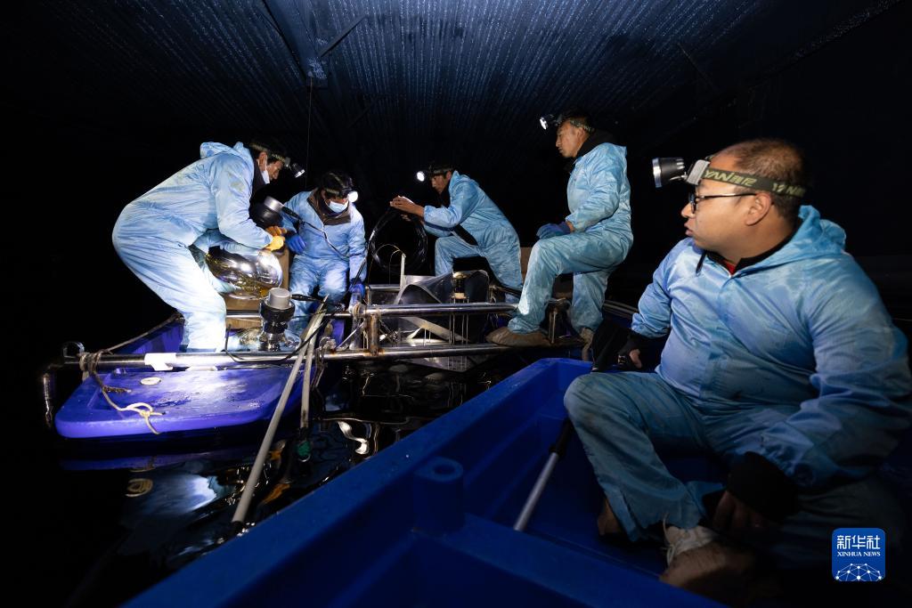 工作人員在水切倫科夫探測器陣列水池里更換實(shí)驗設備(4月21日攝)。