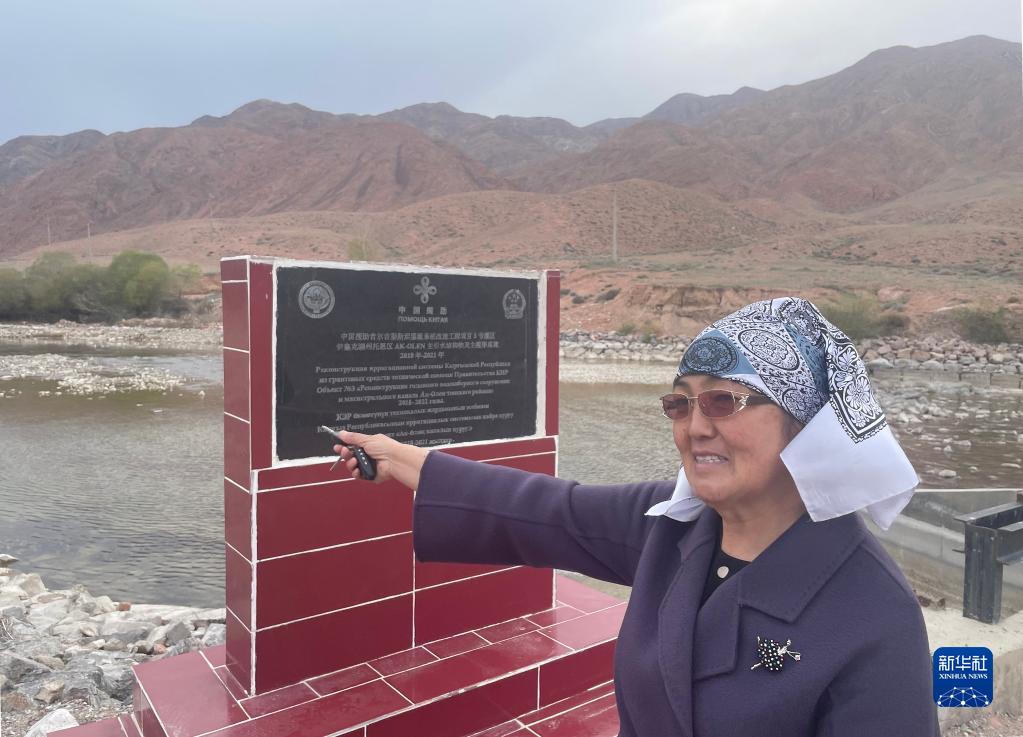 4月25日,在吉爾吉斯斯坦阿克奧隆村,阿克奧隆村前村委會(huì )主任瑪伊拉姆·卡迪拉列娃站在中國援吉灌溉系統改造工程的紀念碑旁。