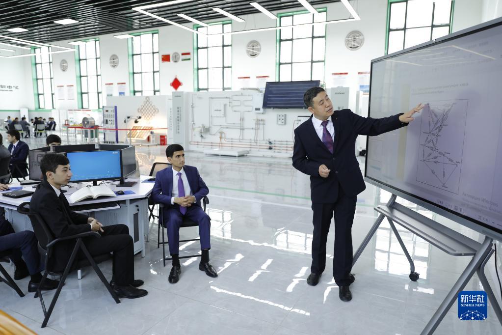 4月12日,在塔吉克斯坦首都杜尚別的魯班工坊內,來(lái)自天津城市建設管理職業(yè)技術(shù)學(xué)院的老師吳正鵬(右一)向學(xué)生講解測繪實(shí)踐知識。