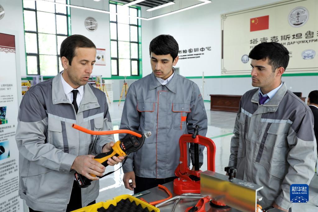 4月12日,在塔吉克斯坦首都杜尚別的魯班工坊內,塔方教授向學(xué)生演示鋼管裁切的注意事項。