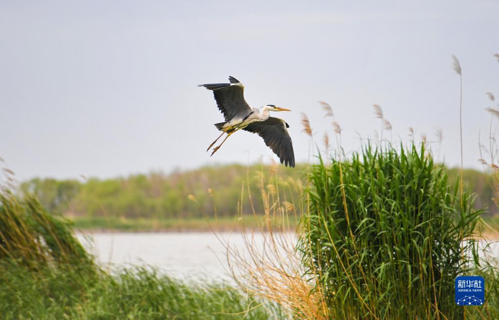 5月6日,蒼鷺在中國河北省衡水湖飛翔。