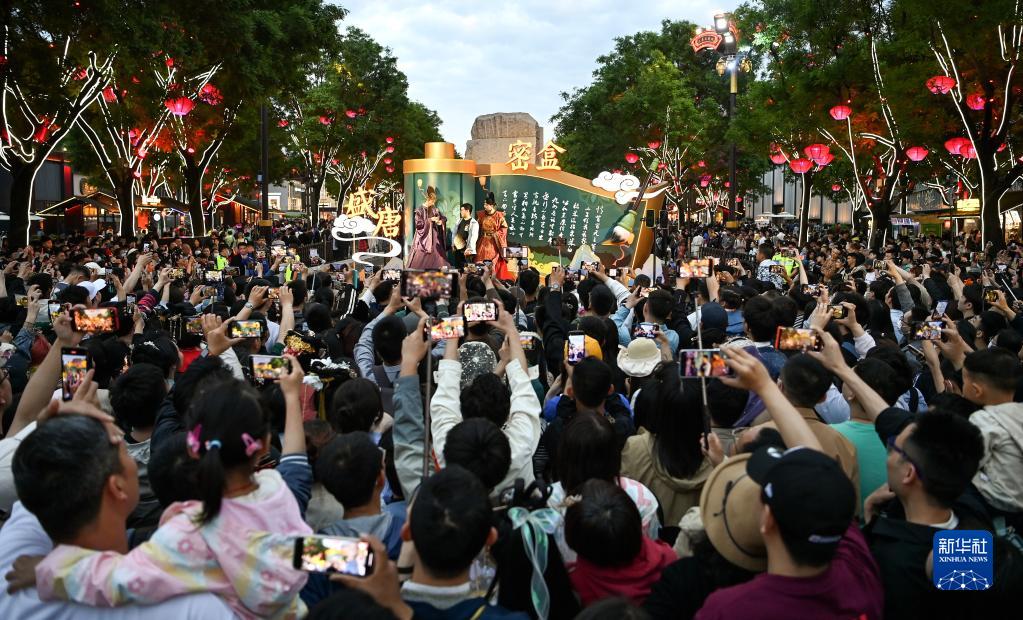 游客在西安大唐不夜城觀(guān)看互動(dòng)節目“盛唐密盒”(5月8日攝)。