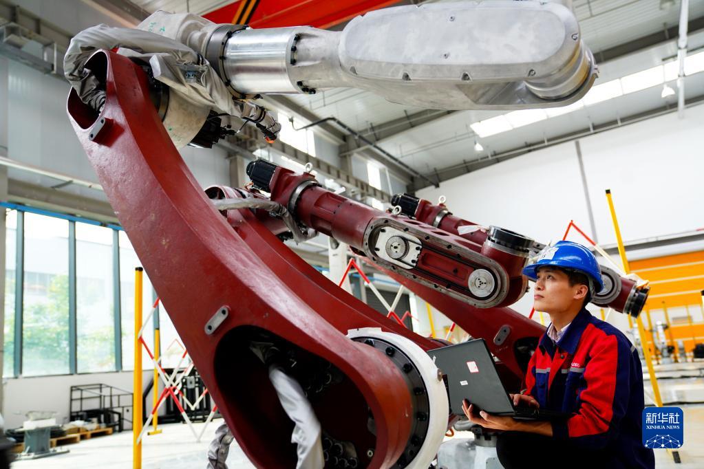5月11日,在鄒城市機器人產(chǎn)業(yè)園,工作人員在生產(chǎn)調試工業(yè)機器人。