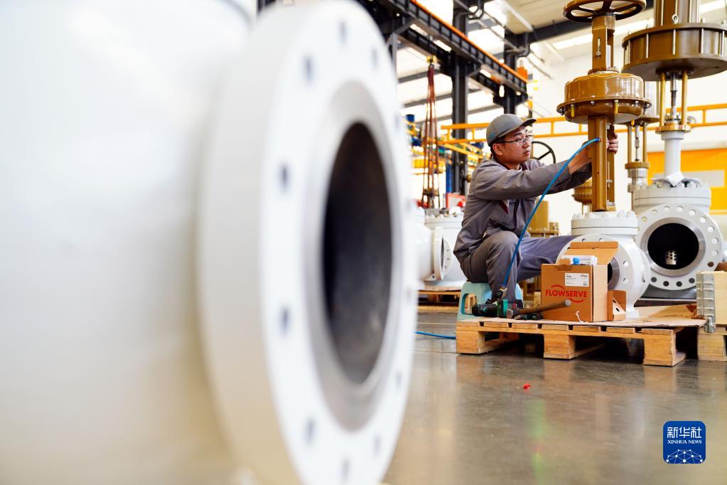 5月11日,在鄒城市艾坦姆流體控制技術(shù)(山東)有限公司,工人在加工高端流體閥。
