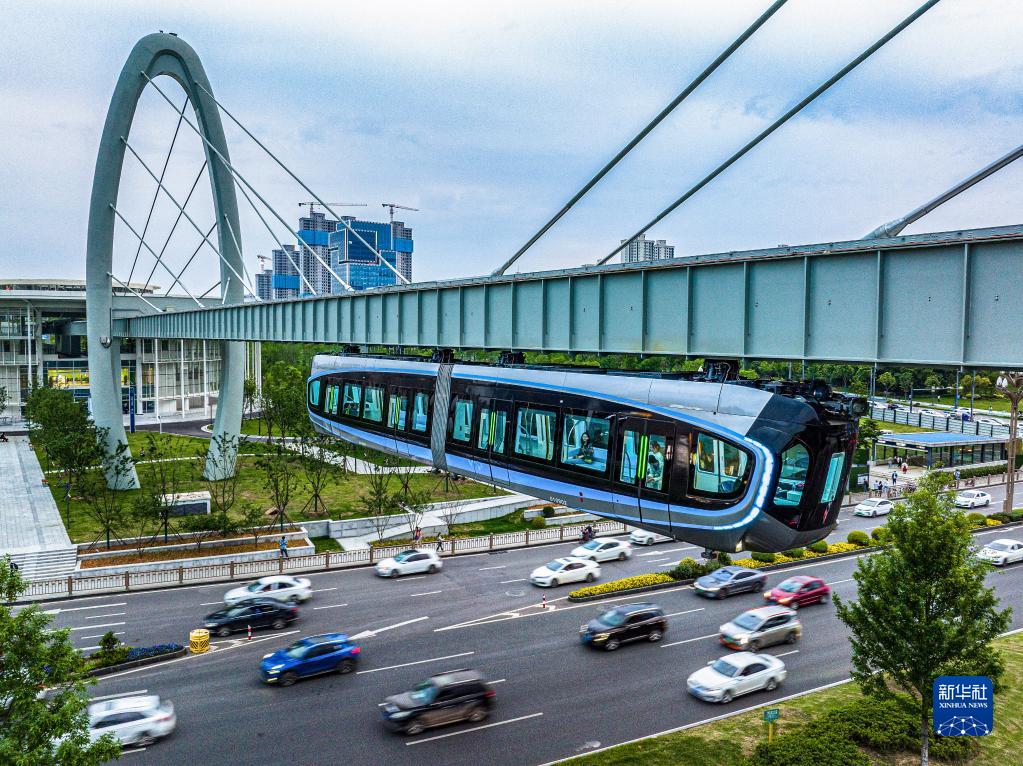 5月9日拍攝的武漢“光谷光子號”空軌列車(chē)(無(wú)人機照片)。
