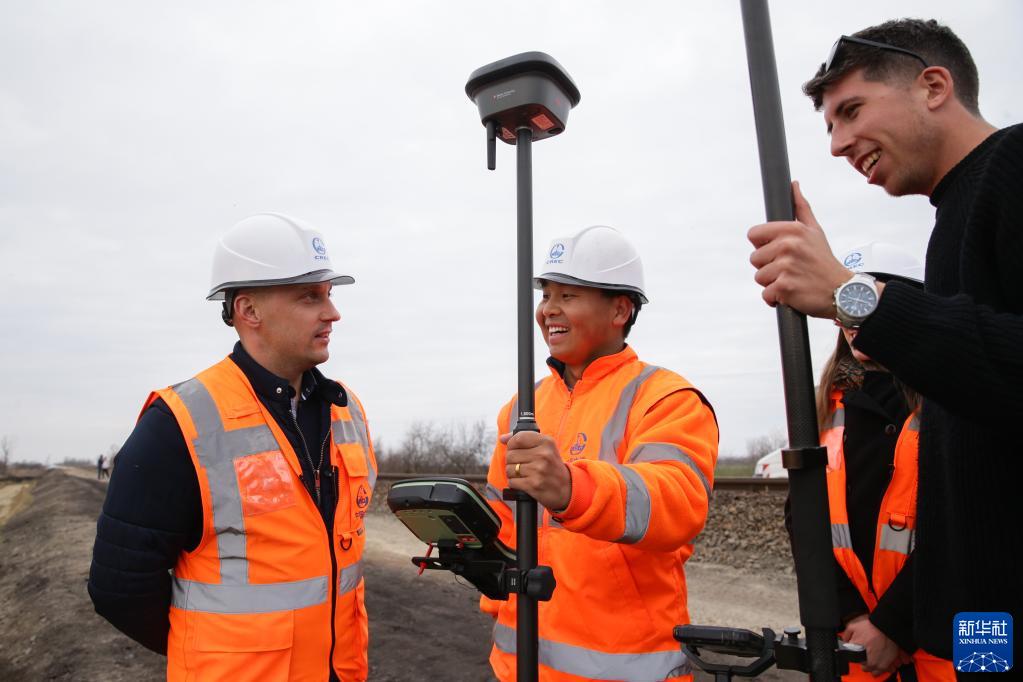 2月22日,在匈牙利索包德薩拉什,翁布魯施(左一)在匈塞鐵路匈牙利段工地與同事交流。
