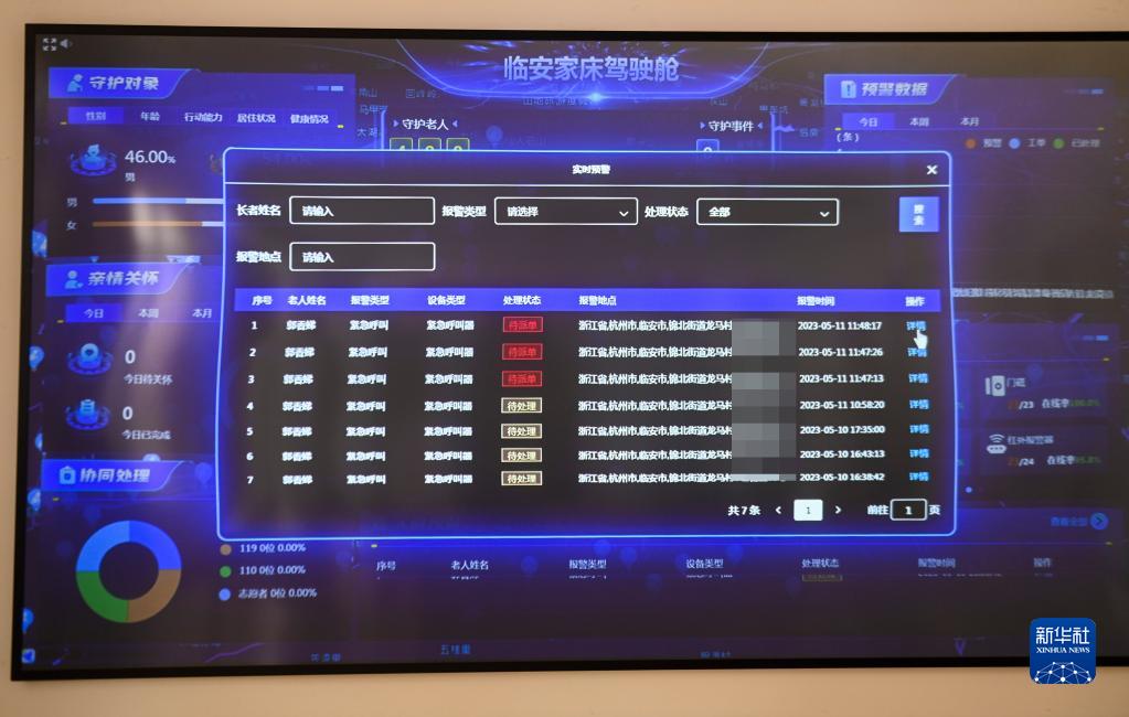 這是杭州市臨安區智慧養老服務(wù)中心的數字監管平臺上的臨安區各地家庭養老床位顯示的緊急呼叫情況,將會(huì )第一時(shí)間通知家屬或者助老員上門(mén)查看(5月11日攝)。