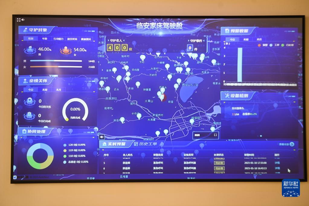 這是杭州市臨安區智慧養老服務(wù)中心的數字監管平臺上的臨安區各地家庭養老床位服務(wù)的實(shí)時(shí)數據(5月11日攝)。