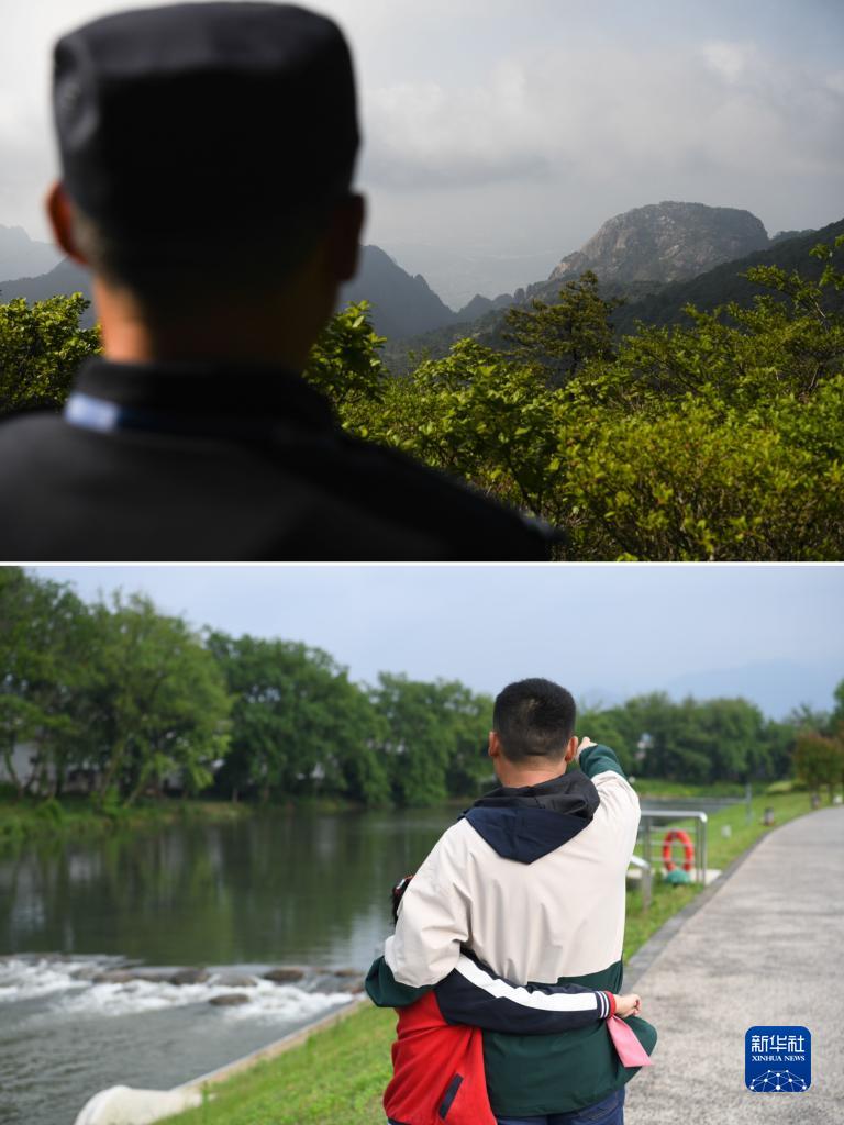 這是一張拼版照片。上圖:秦志平在黃山之巔俯視山腳,看向家的位置(5月8日攝);下圖:在安徽省黃山市黃山區,休假中的秦志平(右)和女兒秦靖妍散步途中,指著(zhù)黃山的方向,告訴女兒自己守護山林的故事(5月7日攝)。