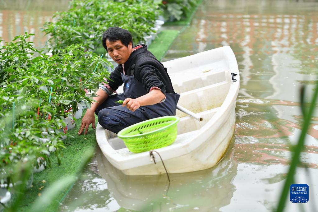 5月11日,在長(cháng)沙市望城區高塘嶺街道湘江村,農民采摘水上種植的辣椒。