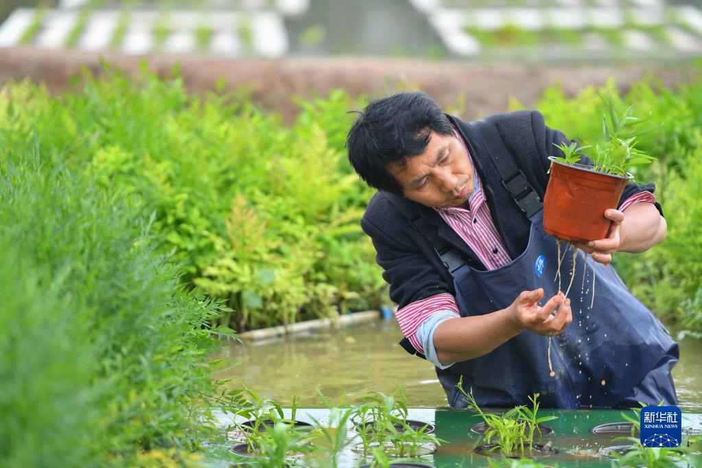 5月11日,在長(cháng)沙市望城區高塘嶺街道湘江村,農民檢查水上種植的空心菜的根部。