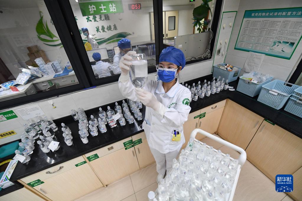 5月10日,在廣西南寧市第四人民醫院,黃小賢在給病人備藥。