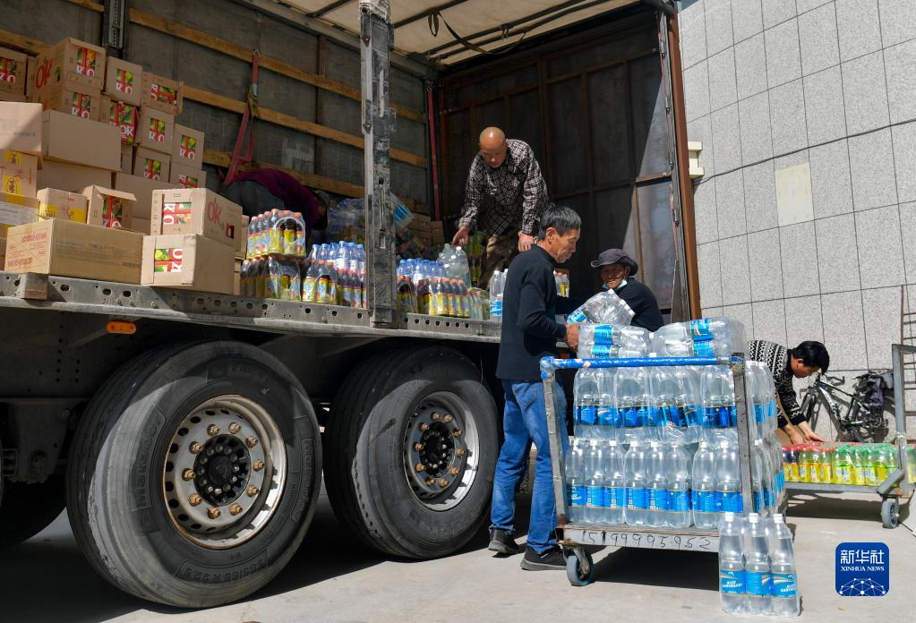 在新疆霍爾果斯一處貨物倉庫區,裝卸工人將進(jìn)口食品搬下入境貨車(chē)(5月8日攝)。