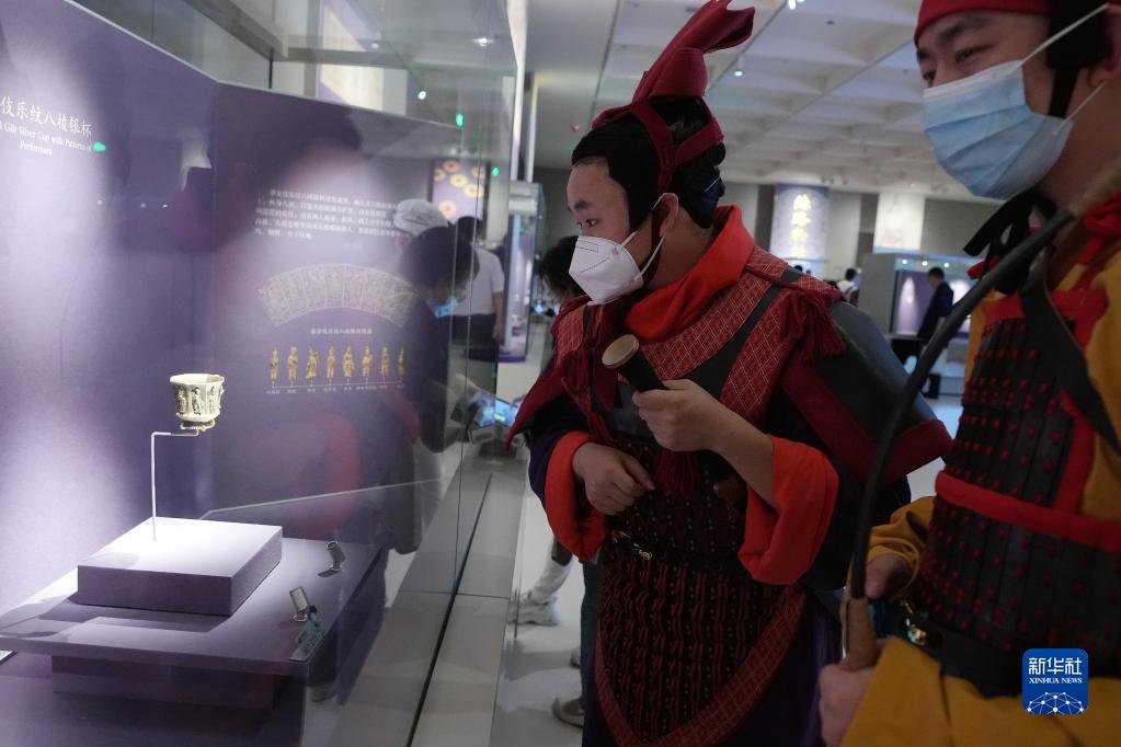 游客在陜西歷史博物館“大唐遺寶——何家村窖藏出土文物展”上參觀(guān)(2022年5月18日攝)。