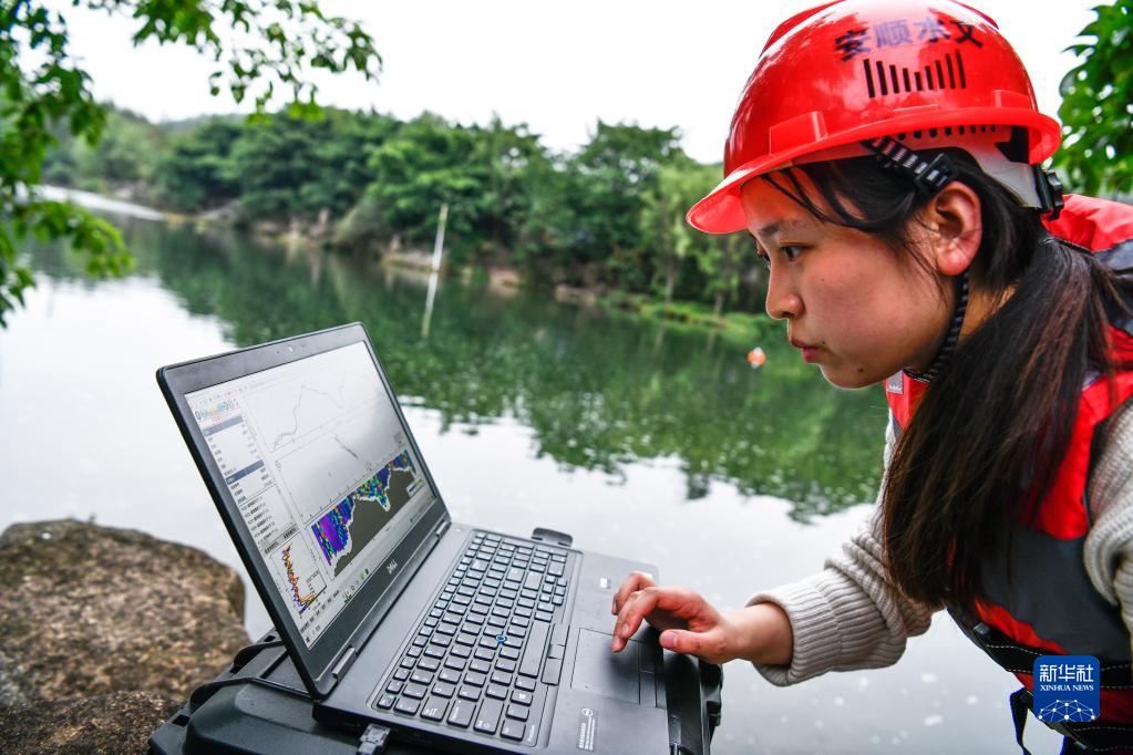 5月10日,在貴州省黃果樹(shù)水文監測站附近,水文工作人員在查看河流剖面流速測量實(shí)時(shí)數據。