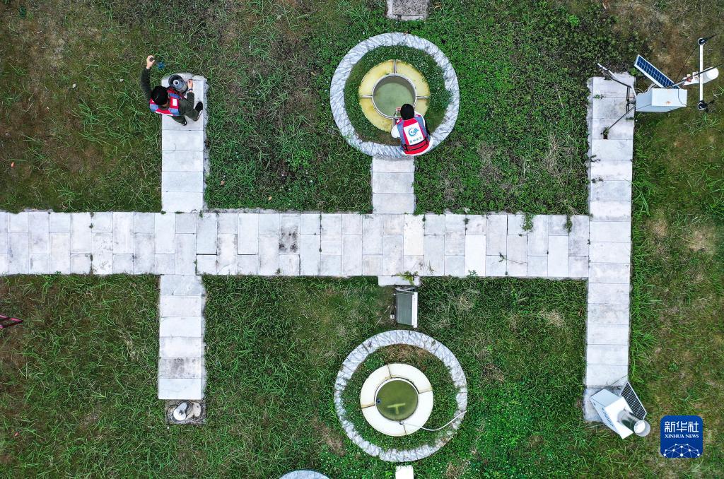 5月10日,在貴州省黃果樹(shù)水文監測站,水文工作人員查看蒸發(fā)系統監測和降雨量觀(guān)測情況(無(wú)人機照片)。
