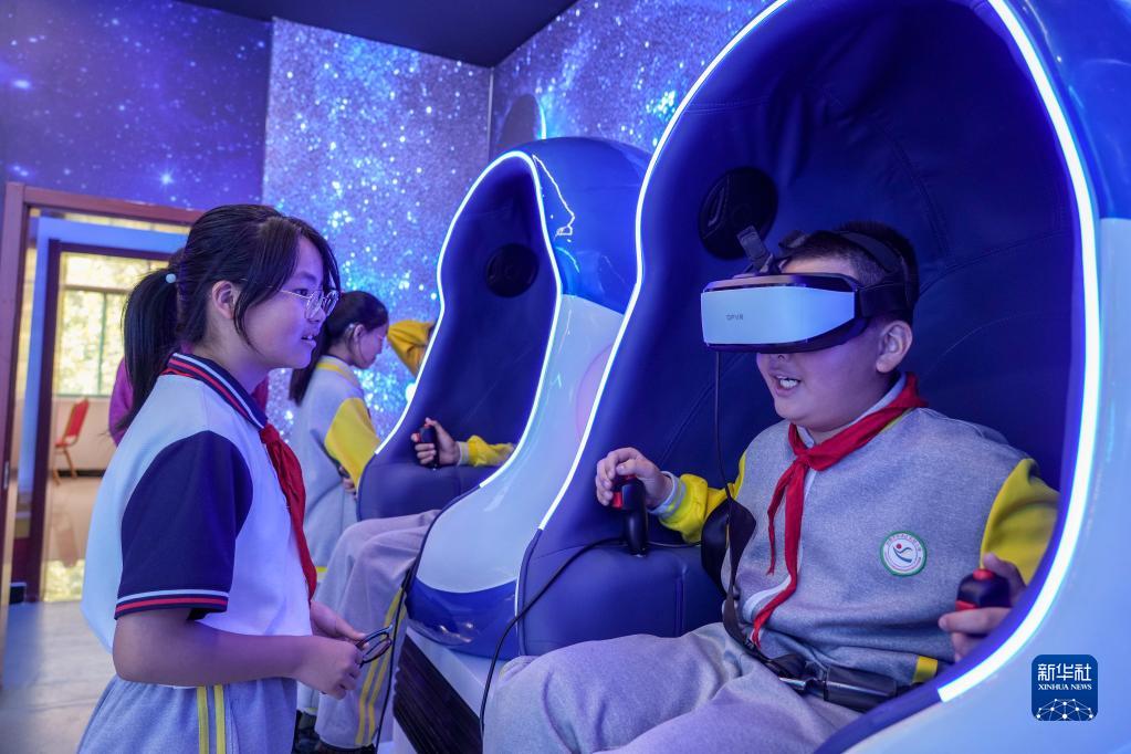 5月11日,小學(xué)生在馬店村科普體驗中心內體驗VR科普展品。