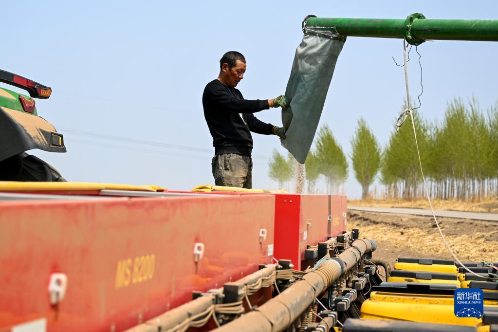 5月11日,呼倫貝爾農墾大河灣農牧場(chǎng)有限公司工人將肥料加入播種機械。