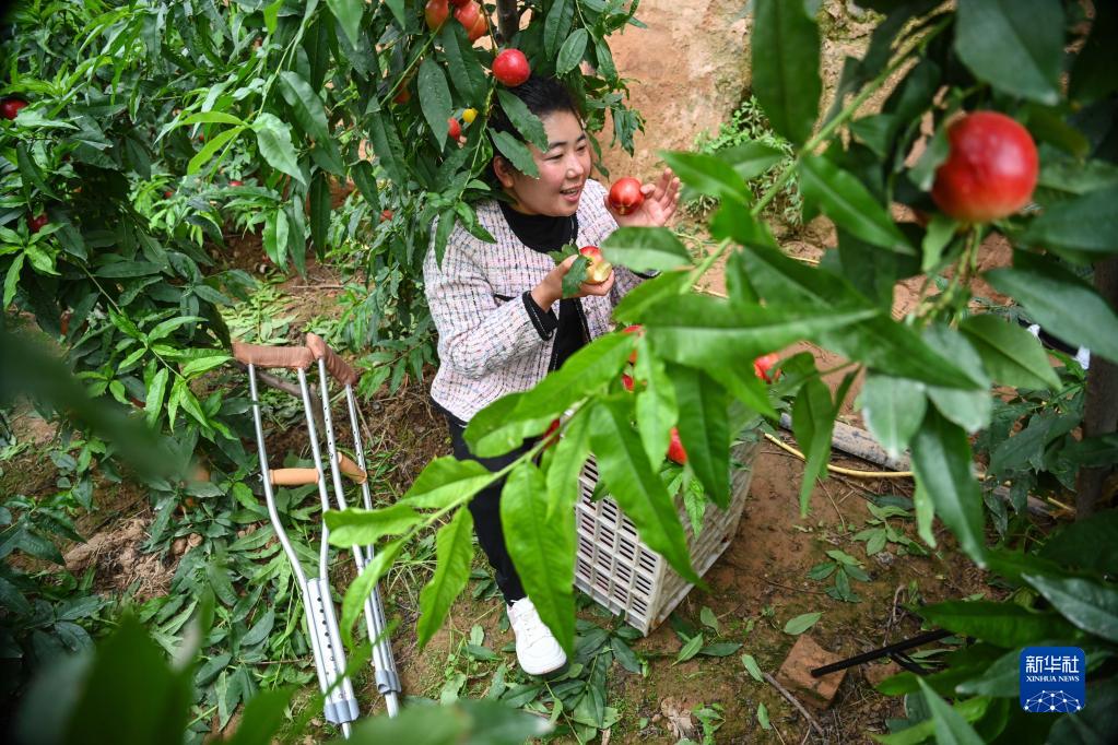 5月10日,馬寧在大棚里直播帶貨銷(xiāo)售油桃。