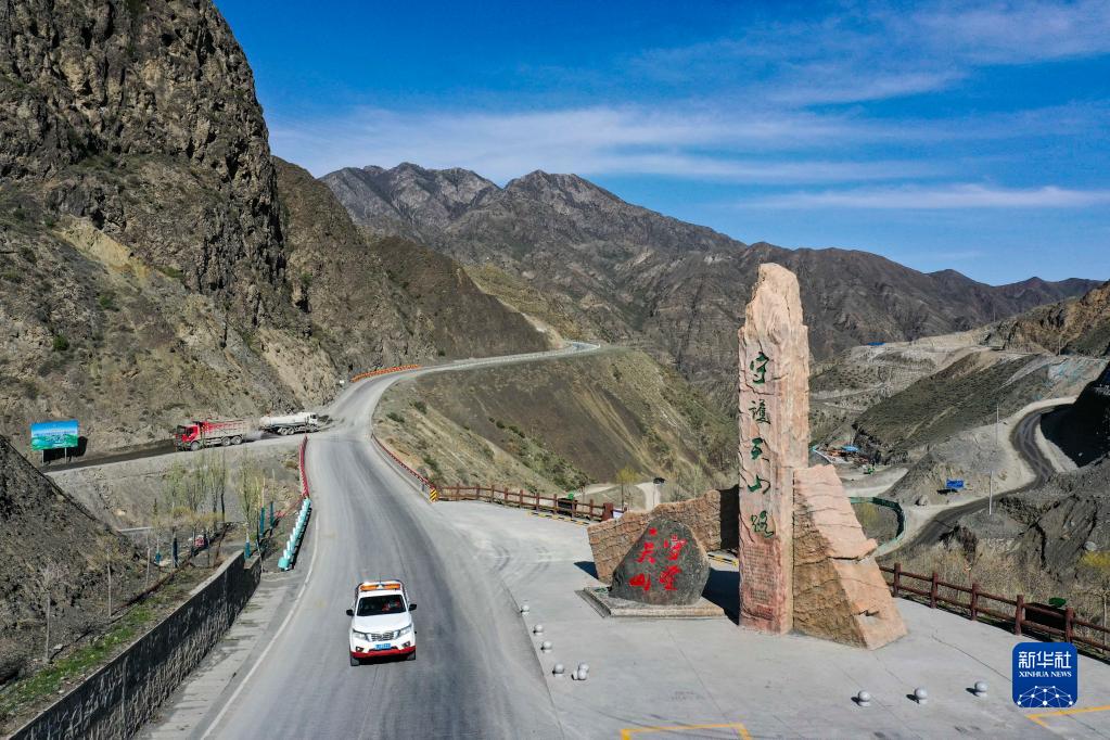 烏蘭薩德克養護站的工人駕車(chē)下山,途經(jīng)獨庫公路旁的“守護天山路”文化景觀(guān)雕塑(5月11日攝,無(wú)人機照片)。