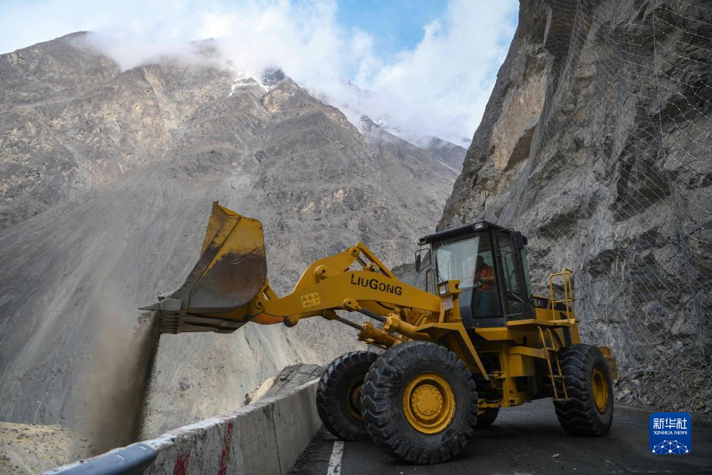 烏蘭薩德克養護站的工人駕駛裝載機在獨庫公路上清理碎落的山石(5月8日攝)。
